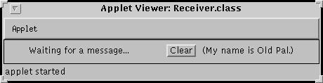 Try this: Click the Send message button of the top applet (the Sender). Some status information will appear in the Sender's window, and the Receiver will confirm (with its own status string) that it received a message, After you've read the Receiver status string, press the Receiver's Clear button to reset the Receiver. In the Sender's text field labeled "Receiver name:," type inbuddyand press Return. Since "buddy" is the Sender's own name, the Sender will find an applet named buddy but won't send it a message, since it isn't a Receiver instance.