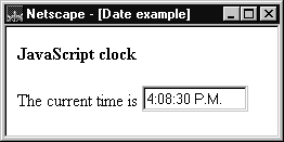 Date: it displays a continuously-updated digital clock in an HTML text field. This is possible because you can dynamically change the contents of a text field with JavaScript (in contrast to ordinary text, which you cannot update without reloading the document). The display in Navigator is shown in Figure 11.1.