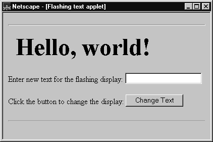 This applet uses the public method setString to specify the text for the flashing string that appears. In the HTML form, the onClick event handler of the button lets a user change the "Hello, world!" string that the applet initially displays by calling the setString method.