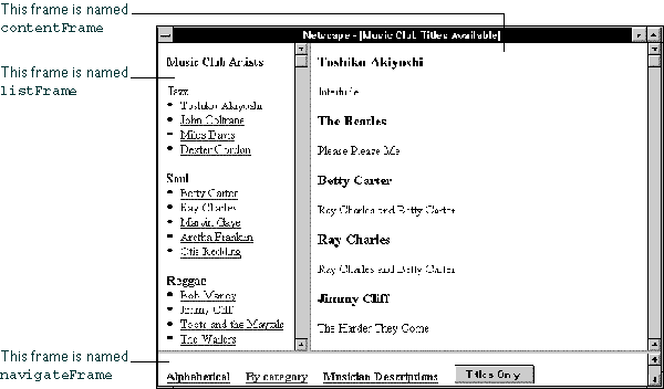 If you designed the frameset in the previous section to present the available titles for a music club, the frames and their HTML files could have the following content: