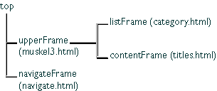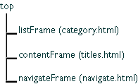 listFrame is top.frames[0]contentFrame is top.frames[1]navigateFrame is top.frames[2]navigateFrame. The top-level frameset would be defined as follows:
